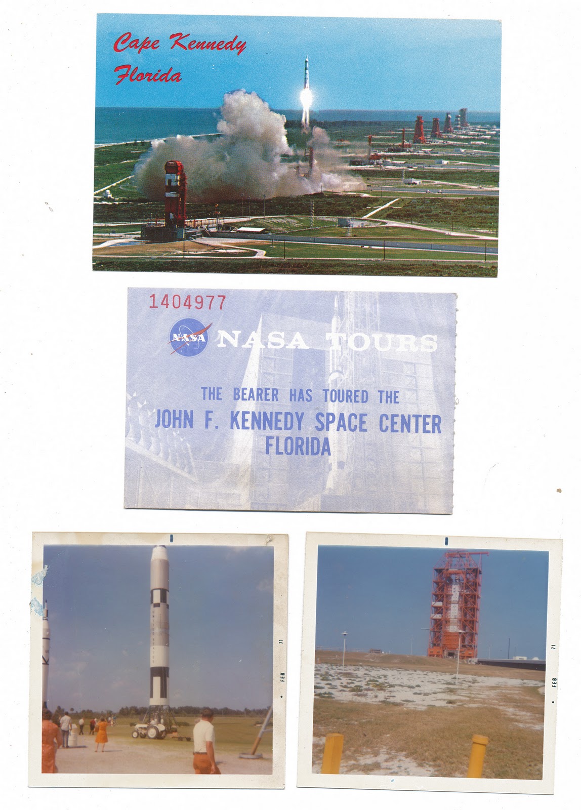 Great collection of vintage color photos and memorabilia from the Kennedy Space Center in Florida. The six photos all have a time stamp of February, 1971. No writing on the visitor's pass or postcard.
