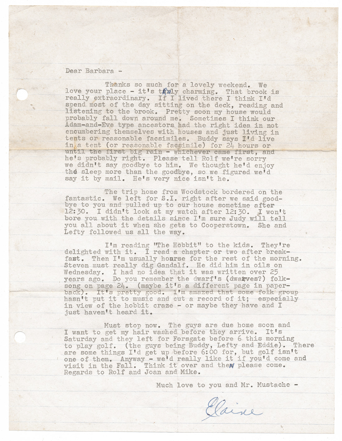 The trip home from Woodstock bordered on the fantastic. We left for S.I. right after we said goodbye to you and pulled up to our house sometime after 12:30. I didn't look at my watch after 12:30. I won't bore you with the details since I'm sure Judy will tell you all about it when she gets to Cooperstown. She and Lefty followed us all the way.