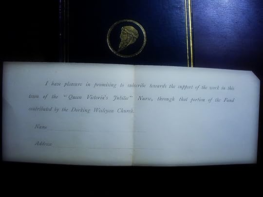 No idea what this is. Found in "The Republic of Plato" (printed 1890). "I have pleasure in promising to subscribe towards the support of the work in this town of the "Queen Victoria's Jubilee" Nurse, through that portion of the Fund contributed by the Dorking Wesleyan Church."