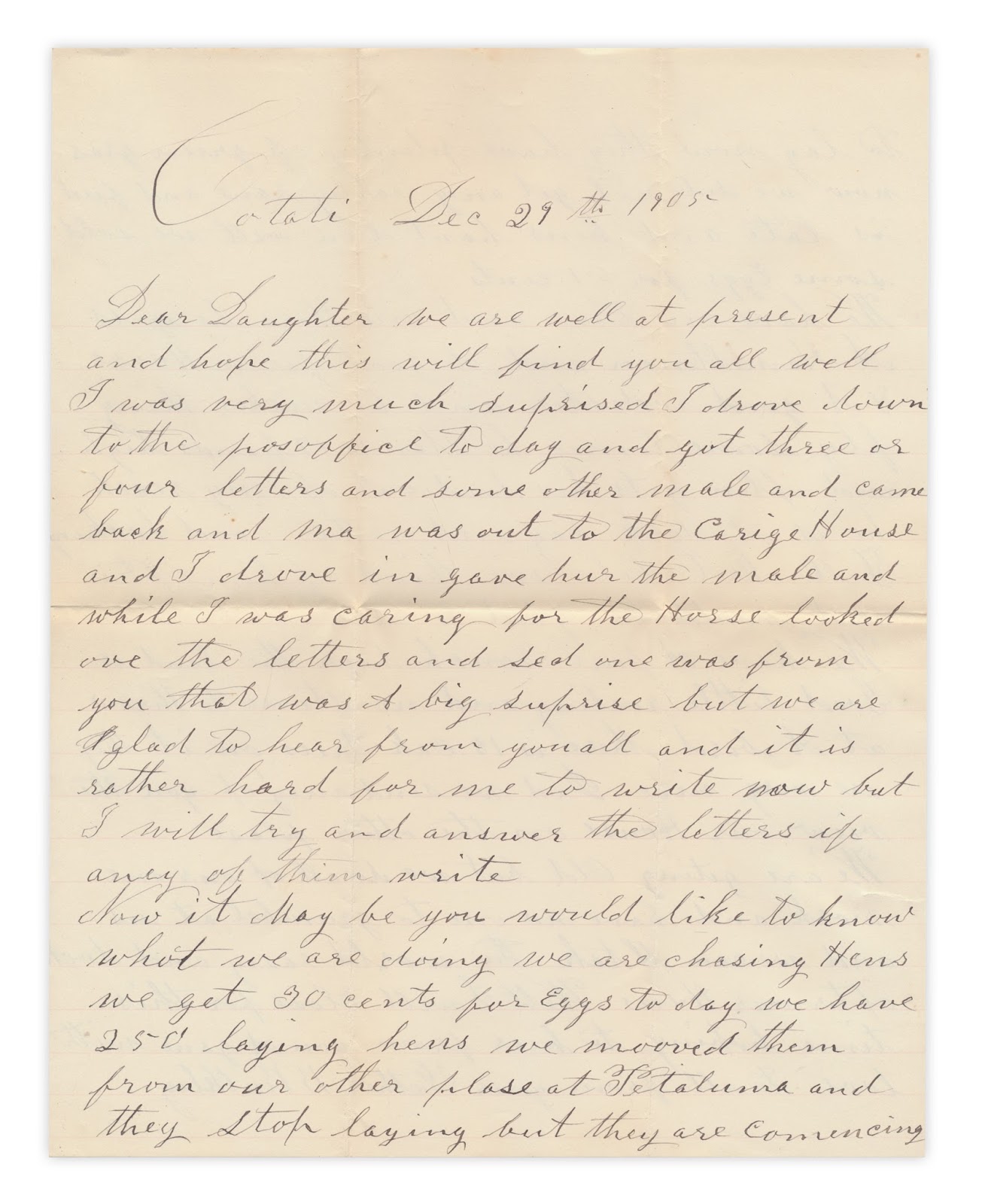 Letter, in original envelope, dated December 29, 1905, Cotati, California . I've left most of the spelling and grammar errors intact: