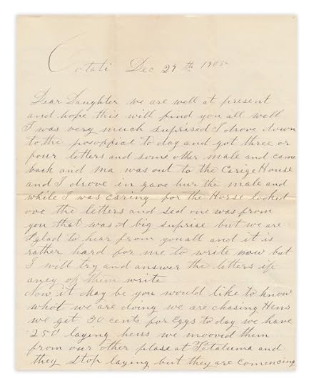 Now it May be you would like to know what we are doing we are chasing Hens we get 20 cents for Eggs to day we have 250 laying hens we moved them from our other plase at Petaluma and they stop laying but they are comencing to lay now they have plenty of green gras now we did not get any early rane and feed is late and hens hant dun well we sold some Eggs for 5 - 1 cents.