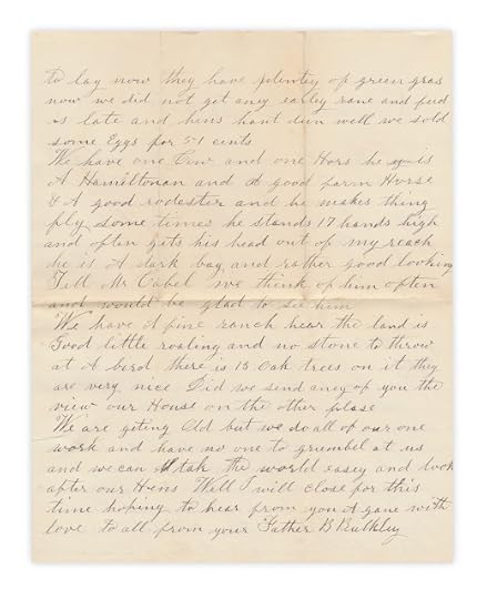 We have one Cow and one Hors he is A Hamiltonan and a good farm Horse & A good rodester and he makes thing fly some times he stands 17 hands high and often gets his head out of my reach he is A dark bay and rather good looking Tell Mr. Cabel we think of him often and would be glad to see him.