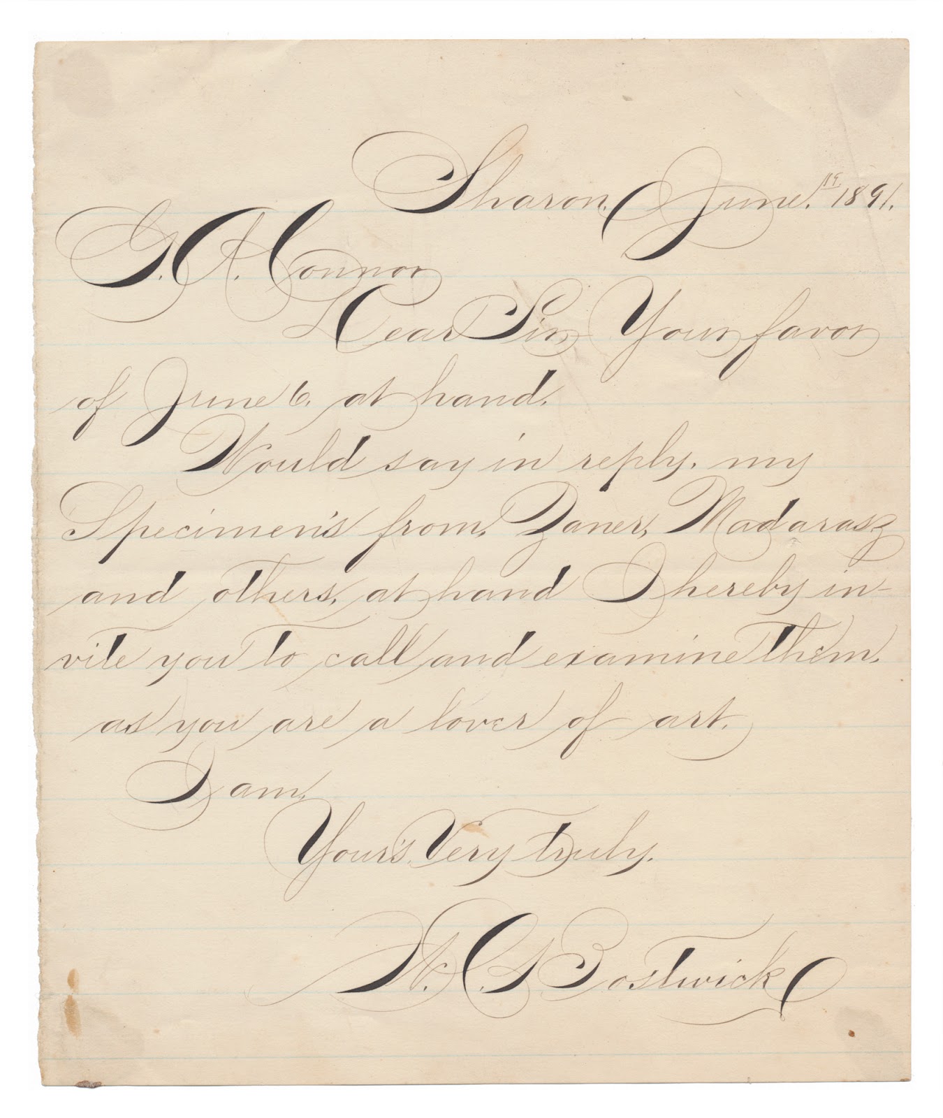 Dear Sir, Your favor of June 6 at hand. Would say in reply, my Specimen's from Zaner, Madarasz and others at hand I hereby invite you to call and examine them as you are a lover of art. I am,Yours very truly,W.I. Bostwick
