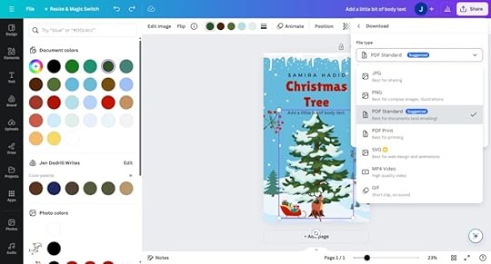 Title and Author Name: Double-click on the text boxes on the template to edit your book’s title and author name. Choose fonts that complement your book’s genre and enhance readability. Text Effects: Experiment with text effects such as bold, italics, or shadow to make your title and author name stand out.**My suggestion on designing your book cover using Canva – go on Amazon or into a local bookstore and look at covers of the genre you write in. Each genre has specific things that readers are used to seeing. For example, I recognize cozy mysteries easily because I know what that genre cover is like.