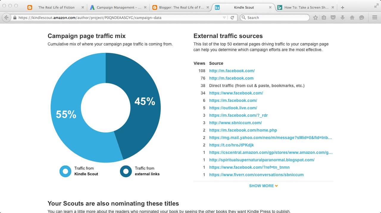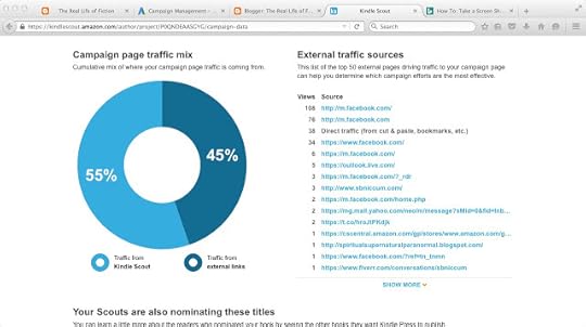 Still, after all my facebooking, most of my traffic comes from Kindle Scout traffic. That is, fellow authors or maybe people who go nominate their friend, sees my book cover and they find it interesting, so out of the kindness of their hearts they nominate me.