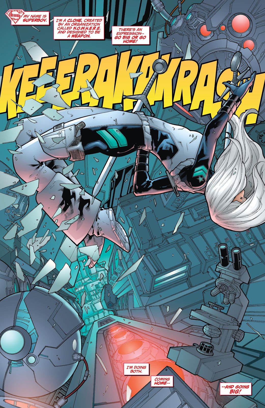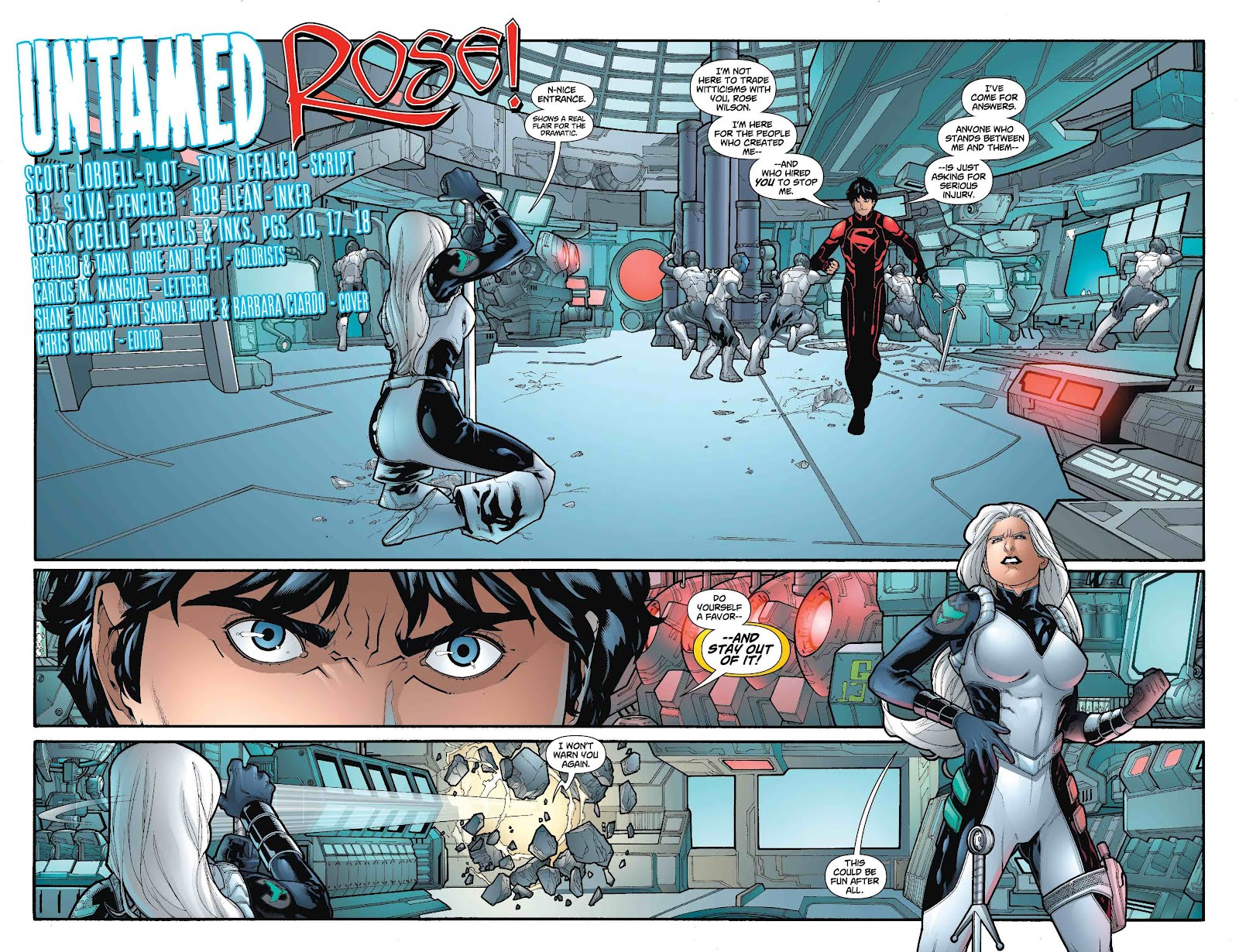 When last we left The Superboy, he was barreling his way to a secret N.O.W.H.E.R.E. facility. He beat the snot out of the new combined forces of the Teen Titans, then confronted Rose Wilson and a bunch of the agents on his way to deliver a smackdown to his current handlers slash creators. Why it has suddenly occurred to him to attack the evil organization, I can’t tell you. I think it would have been a better idea to trash the place when you first woke up or when you’re red headed doctor hottie became super strong and went berserk. But I guess The Superboy isn’t very bright. Or we can blame it on his newly cloned brain still learning how things work. I don’t really know (or care?) but Superboy’s motivations should be clearly established so we as readers can get behind him. It’s pretty hard to relate to a character who seems very resistant to establishing emotional connections and has no clearly established purpose. I feel a little bit like I’m reading about a teenage version of The Hulk who hasn’t turned green yet.
