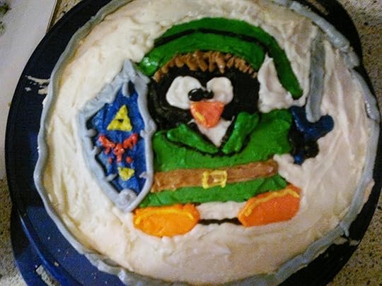 But this year, because of lack of favorite flavor cake mix being available, I decided I would make it from scratch. And I was going to decorate it with an image that combined two of his favorite things: tux the penguin (Linux OS Mascot) dressed as Link from the The Legend Of Zelda series. Oh, and I was going to do this before I did the homemade pizza made from a special kit my mother mailed us from Nova Scotia.