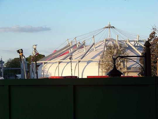 With the first phased openings of New Fantasyland in the Magic Kingdom at Walt Disney World fast approaching, work is chugging along behind the refurbishment walls. Circusland is working on installing planters, trees, and other final touches. One of the tent, seem poking out from behind below, is almost completely re skinned while the other is in final preparations.