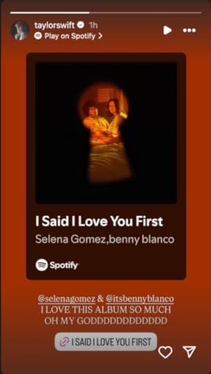 "@selenagomez & @itsbennyblanco I LOVE THIS ALBUM SO MUCH OH MY GODDDDDDDDDDDD," Swift wrote on her story.