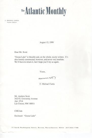 The Atlantic sent a personalized letter, too, something I now know was a common reply to many writers enrolled in M.F.A. programs. While the letter was brief, it was signed by legendary editor C. Michael Curtis, who had helped better some of my favorite stories.
