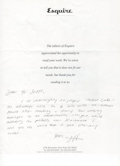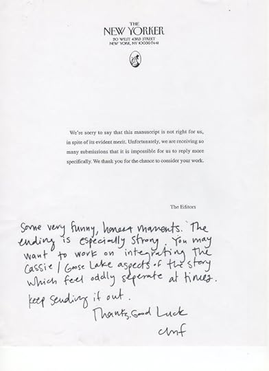 But the one that really surprised me was the note at the end of theNew Yorker's letter. I had been told to not even expect a reply, as the slush piles towered in their offices. The form cited the story's "evident merit," which was helpful, as its merit wasn't evident to me, while the handwritten note praised the story's honesty and humor, as well as its ending.