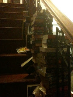 So, here you are, folks...this is the staircase leading up to my "writing loft" (that I never use for writing). Notice the pile of books I have there...it's dangerous going, let me tell you. I've tripped on numerous occasions...and it's nothing compared to the hundreds of books of have in the loft. My husband calls these the ugly books...you see, he collects leather bound books --la dee da (I love you, hehehe ;-) and claims that mine are not fit for public viewing. He also jokes (but not really) that the weight of all of my books in the loft will one day bring the whole house down. We live in a century home (1895ish) so this is not a joke I like...especially with all of the creaking that happens at night when the house settles. Despite the fact that he bought me an ereader last year, I still gravitate toward the "ugly" books and worse, even though I will loan them out (some but not all) I insist on getting them back. I loath giving up my books permanently. I have mentally catalogued any books that I've lost (have not been returned) and will NOT loan to those book thieves again.I, Angela Addams, am a book hoarder. I am.