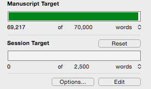 It goes from red to green as you type, both for the overall word count on the project and for the current writing session target. It's pretty nice to watch the bar move to green when you're working. Very motivating. I found a work around with Word but it wasn't the same at all. (Highlighting what I wrote and checking the word count --blah!)