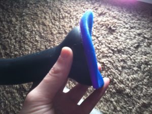 The saddle can be cupped in the hand, or slipped into underwear, or attached to the base of my dildo inside my harness (see pictures below), or rested on my partner’s skin for me to grind against. It’s amazingly versatile–it can be used in penetrative sex or frottage, masturbation or with a partner. Additional possibilities suggest themselves: the pad might cushion a bullet vibe to prevent “numbing out,” or avoid overly intense stimulation when the vibe is being run against an especially sensitive setup, for instance, the base of an inserted NJoy plug…