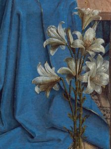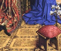 A detail from Jan Van Eyck’s “Annunciation”. The Virgin Mary has the most beautiful blue. Not pictured, however, are Gabriel’s rainbow wings. Which you should also go check out. They’re like majestic, numinous Pride Flags.