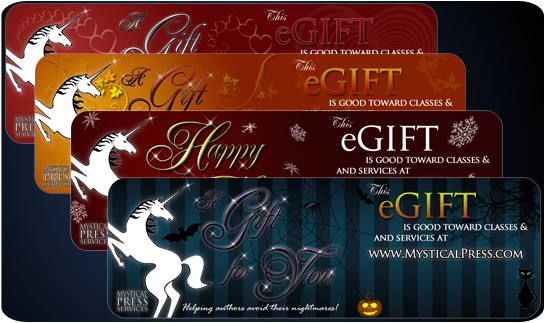 Remember to mention Mystical Press to all your friends and fellow writing pals – here’s why. Mystical Press offers a free Referral Program. Just register on the site and we will assign you a Referral ID. If anyone clicks on your link and makes a purchase, you earn a referral fee! Whether you choose cash or a credit for products or services on the site, consider this our thank you for helping us spread the word. Oh! And before I forget…we offer a wide range of gift certificates designed specifically with the writer in mind. Tired of searching for the “write” present for your author pals? Maybe that next birthday calls for an eGift from Mystical Press!