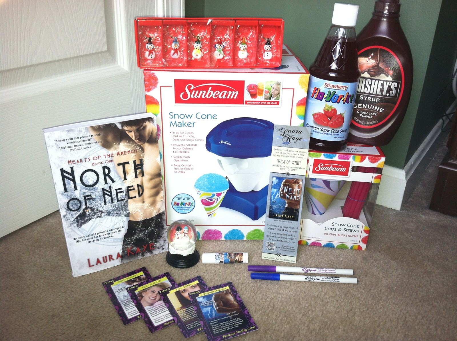Includes 1 signed print copy of NORTH OF NEED, romance trading cards from NORTH OF NEED and WEST OF WANT, an Anemoi bookmark, a Sunbeam snow cone maker plus snowcone cups/straws, Hershey's chocolate syrup, strawberry snowcone syrup, pens, lipbalm, a snowglobe, and snowman wine glass charms. Isn't that fun?Head on over to the auction site - and check out my item's specific listing here. Bidding takes place May 1 - May 31 and there are prizes to win for participating, too.Thanks for reading!Laura