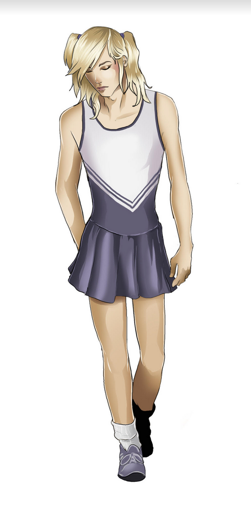 For some reason, a person assigned male at birth stood on the landing of a club wearing a cheer leading outfit. (Ally added crooked pony tails to the image.)