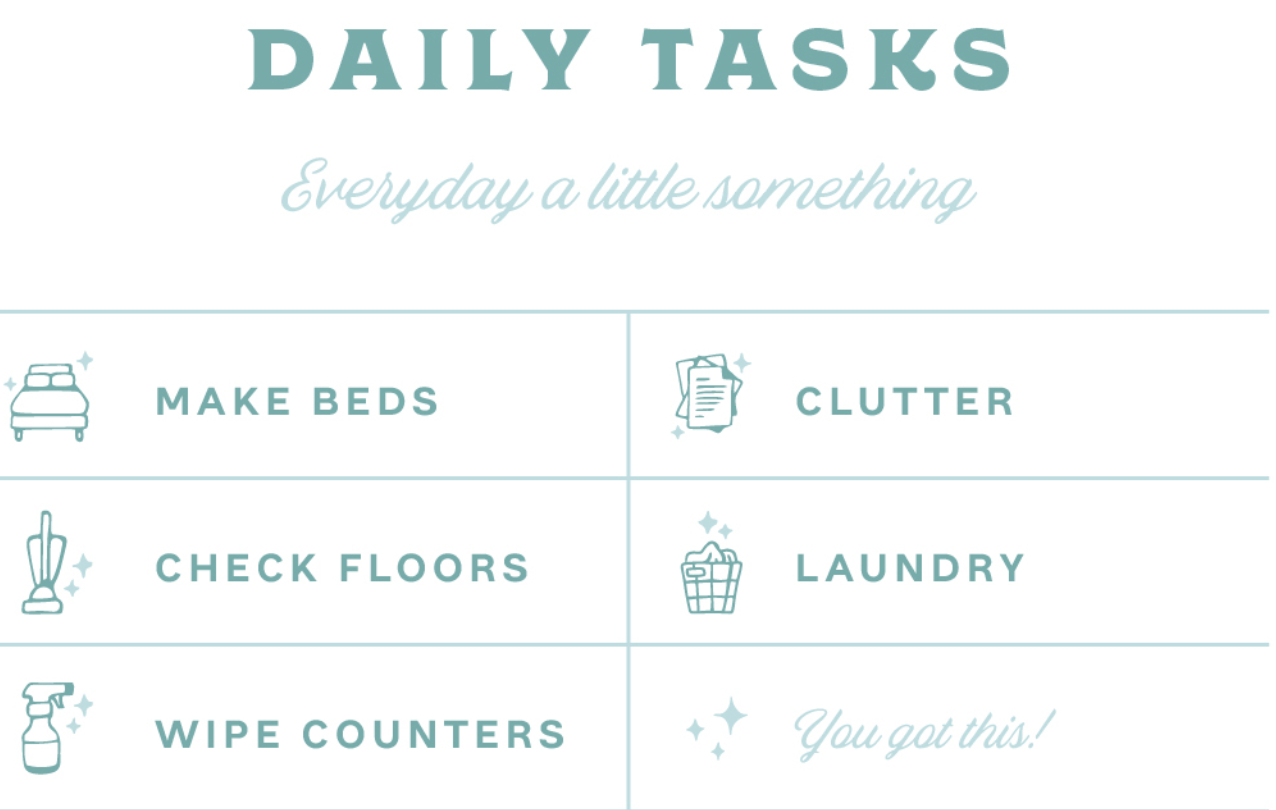 She has developed an easy system to stay on top of basic household tasks: Make Beds (as soon as I get up in the morning I make our bed. I send my robot vacuums about their business (but really this could be a check). I wipe down my counters (about a million times a day). I look for clutter and toss, donate or put back into its home. I do a load of laundry from start to finish (usually several small loads).