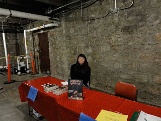 I'm sorry for the slightly out of focus photos my husband Jim took of me at my table and for the fact that I look slightly cold, because in truth it was quite warm near the station's boiler room. You'll see the basement still has the spooky look that contributed to what I hope was a suitably creepy opening for the book.