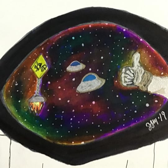 Originally, I wanted it to be like looking out again from the inside of a ship, but the thing about ink is that once you make a ‘mistake’, you have to fudge and work around it if you want to salvage what you’re working on. Sometimes this means abandoning the original concept and going for something else. Now, this looks more like some kind of reward patch someone would get for being the best hitchhiker in the galaxy, and I’m okay with that.