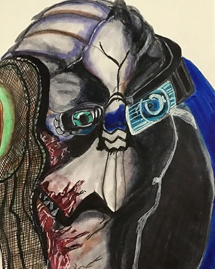 I had no idea what I was going to do for today’s prompt, but I wanted to do something spacey because space is my jam. As I started thinking about injuries while driving early this morning, I realized Garrus Vakarian was a good candidate, especially after he got rocket-launched in the face in Mass Effect 2.