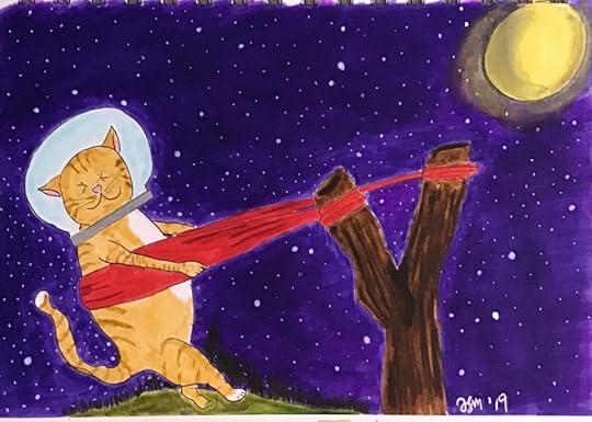 What if the cat was slingshotting himself to the moon in the dead of night? What if that cat was my tubby little orange tabby all excited about going to space, which his mom talks about all the time, so it must be amazing and he wants to go there so bad he can taste it. She would be super proud, he just knows it.