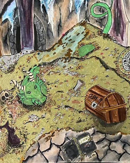 When I started thinking about the “Treasure” prompt, a million things came into my mind. Pirates, mermaids underwater with their dinglehoppers, but the one that stuck with me most was the notion of a dragon sleeping in the treasure it’d hoarded over the years. That was what I finally settled on when I sat down to begin the long process of working on this piece throughout the day.