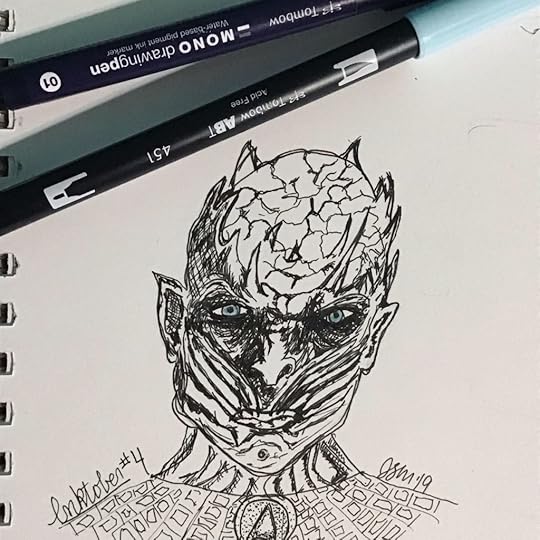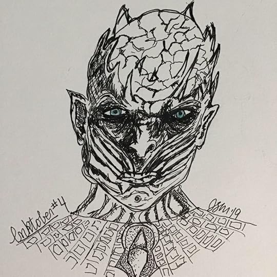 I thought about this particular prompt for several days leading up to it, and only just decided this morning to try my hand at a quick sketch of The Night King from Game of Thrones. I mean, really, who is more frozen than that, aside from that disney girl with the braids? I spent about an hour this morning scribbling this out, trying my hand at a few techniques I was interested to test out for the first time, and though it’s a little on the sloppy side, I’m not sad about how it came out.