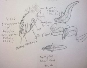 Like all rotifers, trochates have three body segments: head, trunk, and foot. The head and trunk are supported internally by a calcified skeleton evolved from the mastax (used in basal rotifers to process food).