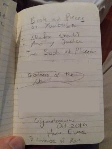 Page one of my FollyCon Notebook contains the cream of my first conversation with Georgina Kamsika, Sarah Dodd, and Micaiah Huw Evans. They suggest you watch Books and Pieces and read The Ninefox Gambit, Ancillary Justice, and the Book of Phoenix.