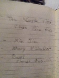 Uh, so I think this is still from that first conversation with Georgina Kamsika, Sarah Dodd, and Micaiah Huw Evans. And I think these recommendations are mostly from Sarah: The Waste Tide by Chen Qiufan, the works of Xia Jia, Mary Rosenblum, and Rant, by Chuck Palahniuk.