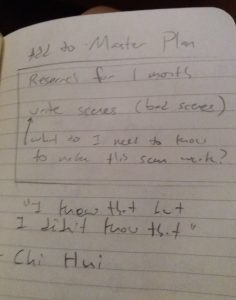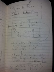 There are also some in between notes featuring me figuring out how to get science into science fiction. These include such gems as “the scientific process as plot” and “Characters work their way back through the chain of worldbuilding.”