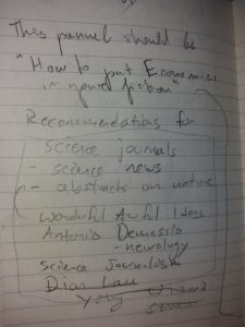 Then I actually went to a Follycon panel! It was called (I think) “How to Put Science in your Fiction,” and that thing at the top is my wife’s snarky correction.