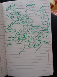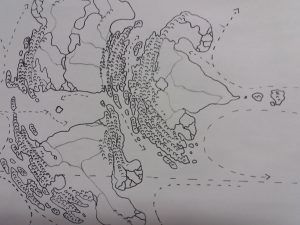 Also I flipped the whole thing east-to-west. Don’t want it to look too much like Europe, Asia, and Africa. These are three new continents! Sacima in the northwest, Phoucia in the southwest, and…uh…Visacia in the east. Now. What sort of people live here?