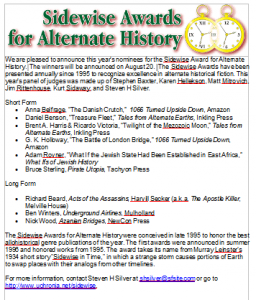 What the hell is going on? My jet-lagged two-year old is getting me out of bed at 2am and my short story is being considered for THE alternate history award? My name is on the same short list as Bruce Ovo-E-Budućnost STERLING? What IS this??