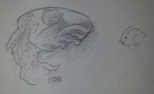 “Draw the rabbit skull, daddy,” she said. “We’ll be conservationists together,” she said.