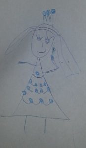 “I can’t draw rabbit skulls, daddy. This is a dolly pretending to be a princess. She has blue diamonds on her dress.”