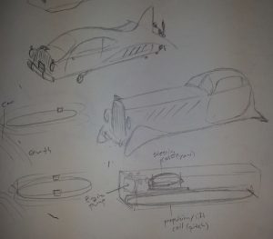 I considered plating the bottom of the cars in cavorite and putting a propeller on the back (top picture), but that just looks silly. I might use the design for the Steampunk aesthetic of Knickerbocker Station, but for diesel-punk I’m sticking with my original idea (bottom).