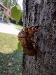 I called over Maggie and her cousin and pointed the cicada out to them. They went off to find a half dozen cast-off molts. I showed them the folded, piercing mouth-parts, telling the girls how the nymphs suck sap from tree roots until they climb out of the ground and molt into adults with wings but no mouths. If that’s a metaphor, I don’t want to use it.