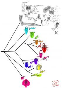 You might remember my first radiation of conodonts last month. Now it’s time for phase two of my art/evolution experiment. With the aid of a dice, I halved the numbers of condont species, leaving only five to radiate into 11 new (and somewhat better drawn) species. These are: