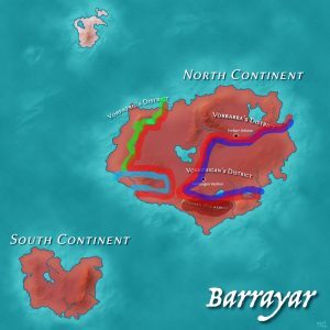 The origin of the “barr” element has been lost in time (the proposal that is derives from English “bar” has been hotly rejected). The double r in the Latin transliteration indicates a rolled or trilled r, as opposed to the more usual “warm” or “guttural” r. R in Barrayaran languages is “warm” by default, but becomes trilled when following a stressed vowel.