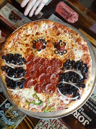 My husband and I went to Point Pleasant West Virginia for a few days to visit the Mothman museum and other touristy-type stuff. While there, we went to a local pizza place that boasted a “Mothman shaped pizza”…not sure it really looks like the Mothman to me lol…