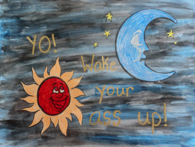 “Wake Up!” mixed media collage on paper, 9″ x 12″