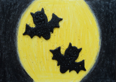 “Two Black Bats” mixed media on paper, ACEO size (2.5″ x 3.5″)