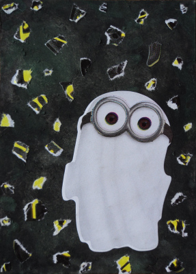 “Ghost Minion” collage on paper, ACEO size (2.5″ x 3.5″)