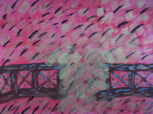 “Burning Bridges” acrylic on paper, 9″ x 12″.