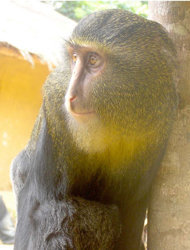 In 2007, scientists working in the remote forests of the Democratic Republic of Congo spotted an unusual monkey in a village. The monkey had a beautiful golden mane and amazing eyes, and it lived with a 13-year-old girl named Georgette. Apparently, the people of that area of the Congo were already familiar with this type of monkey because they hunt them. The local name for the monkeys is lesula. However, scientist John Hart and other researchers from the Lukuru Wildlife Research Foundation understood the possibility that this was a species of primate new to science. It took five years of work, but Hart and his team proved that the lesula is a new species, making it only the second new type of monkey found in the last 28 years. The lesula's formal name is Cercopithecus lomamiensis. One startling thing that sets them apart is the males have bright blue rear ends. Unlike their loud colors, though, lesula tend to be shy animals who forage by themselves or in small groups. They spend a lot of time on the ground rather than up in trees, and eat fruit, flowers and bugs. Adult male lesula may weigh up to 7 kilograms or about 15 pounds. In their detailed paper published in PLOS One, scientists describe how they found one lesula who'd just been attacked by an eagle. The eagle flew away and left the wounded monkey up in a tree, where she soon died. Her body was collected for study. But humans are a more serious threat to lesulas. Despite living in very remote forests, the lesula may be in trouble because of the bush meat trade. When farm animal meat isn't available, people in the Congo and other parts of Africa will buy meat of almost any type. This meat may not be healthy to eat and may come from endangered animals. It would be a shame to lose the lesula so soon after finding it. (Here's the detailed article published in PLOS One, and a shorter article found on Yahoo. The photograph is by Maurice Emetshu. Thanks to Torger, who alerted me to this discovery.)