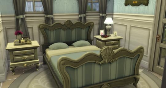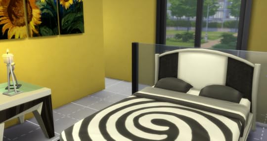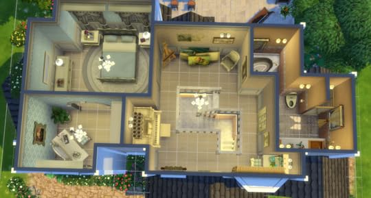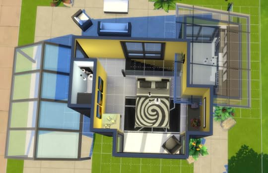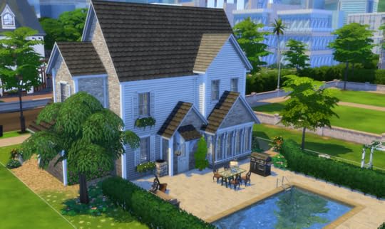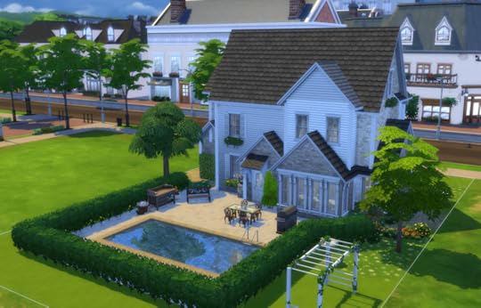 Family home with landscaped front yard and large backyard with swimming pool. Spacious house with one bedroom, perfect for a couple. I imagined this as the house of two grandparents looking forward to having their grandkids visit during the summer.