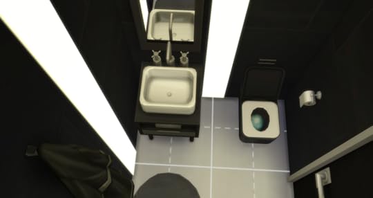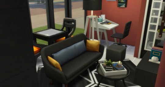 The downstairs exists of a living room / dining area, with a small space for a desk, and a large (well, for the size of this house), L-shaped kitchen. The back wall of the kitchen is covered in glass, which makes it look more spacious. A double door leads from the kitchen to the terrace. The bathroom is also downstairs, and looks sleek and modern like the rest of the house. The color used throughout is black, but with some flashy other colors mixed in: orange/red for the downstairs and green/yellow for the upstairs floor.